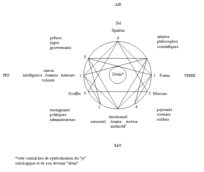 Tout en étant transcendantal, l'art est unes des composantes de la dimension ontologique. "Tout homme est un artiste". Mais il n'est pas que cela ; l'homme est constitué de multiples qualités fonctionnelles qui se concatènent et se manifestent autant sur le plan personnel que social. C'est en abordant cette complexité dans son ensemble que nous arriverons le mieux à saisir l'homme et le monde dans sa totalité, pour éviter de sombrer dans l'unilatéralisme et l'uniformisme. Dans le schéma qui suit, nous situons l'art comme une fonction inscrite dans la circonférence qui entoure le vide central, seuil du "je" ontologique, là où seul le divin a droit de siéger, en d'autres termes, là où l'unité s'accomplit dans la diversité. Quand une des fonctions périphériques s'hypertrophie, devient "égocentrique", se saisit du vide central (comme le fait aujourd'hui l'économicisme), l'équilibre harmonique est rompu, mettant en péril la vie et sa destinée sur notre petite planète. En résultent aliénation et idolâtrie vis-à-vis d'un modèle réifié, érigé en grande idole maître du monde.