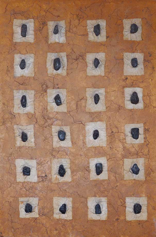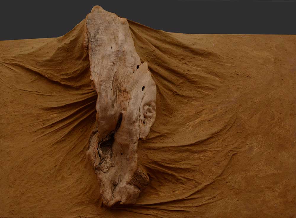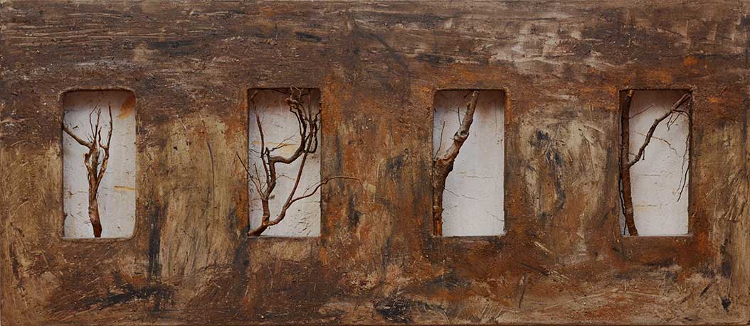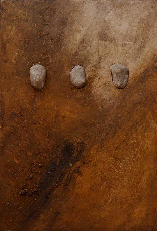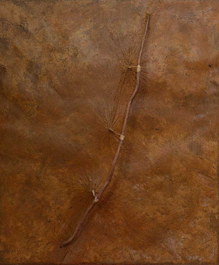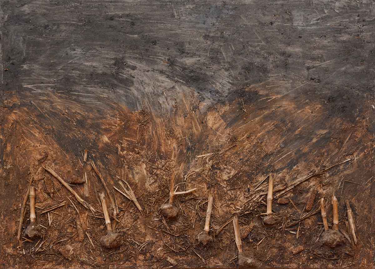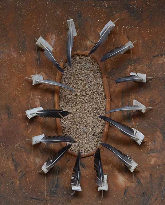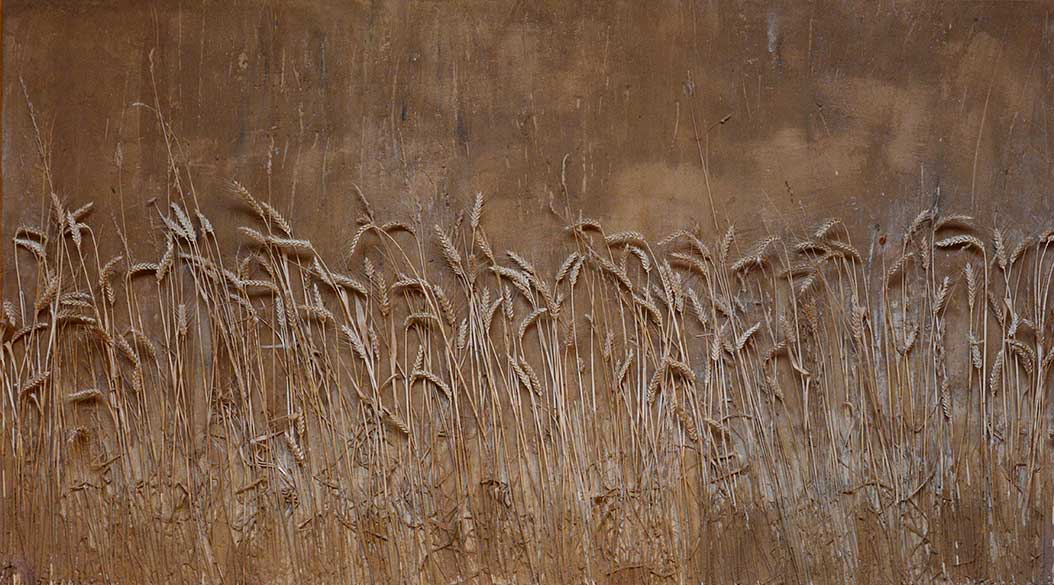 Le travail que j’appelle TERRE est né dans les forêts, dans les champs et les chemins, où j’ai installé mes ateliers éphémères. De ma danse avec l’herbe, la frondaison des arbres, la terre, la poussière, le vent, la lumière sont nées ces œuvres, composées d’humus, de racines, d’épis de blé, de pierres, de glands, d’os, de plumes dressés sur la toile, donnant naissance aux sens qui émergent en moi de cette refonte avec la nature, avec la matière même qui m’inspire et m’aspire.