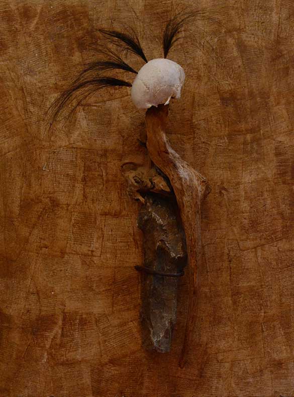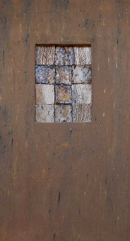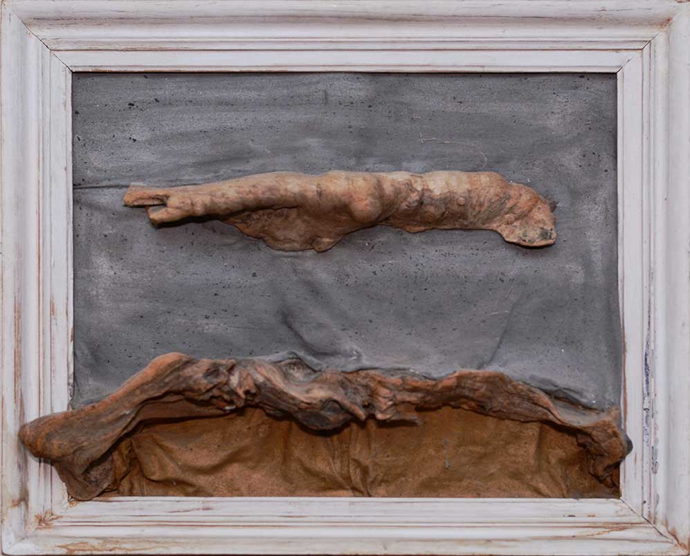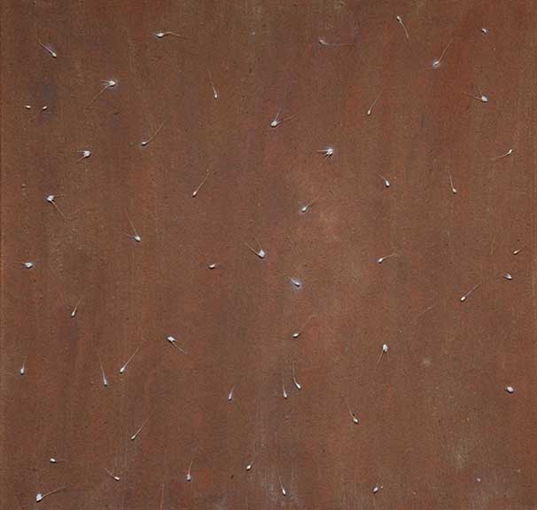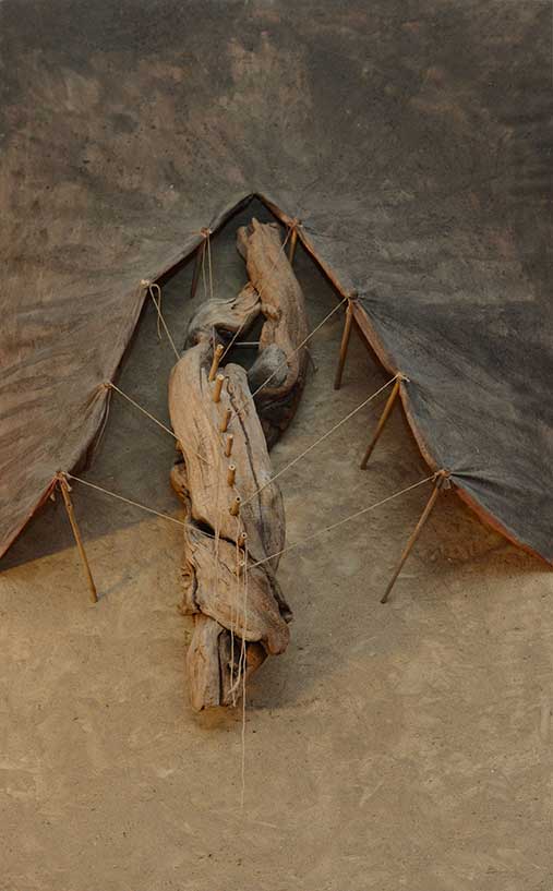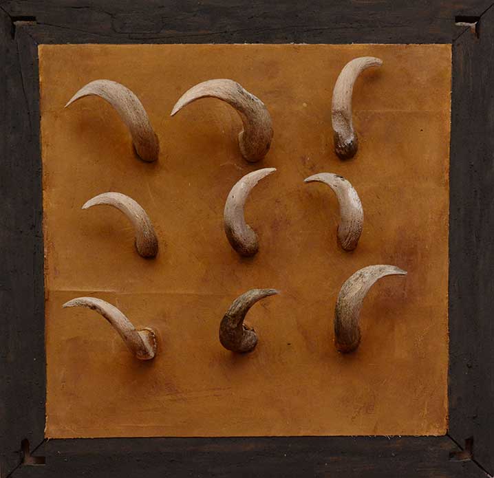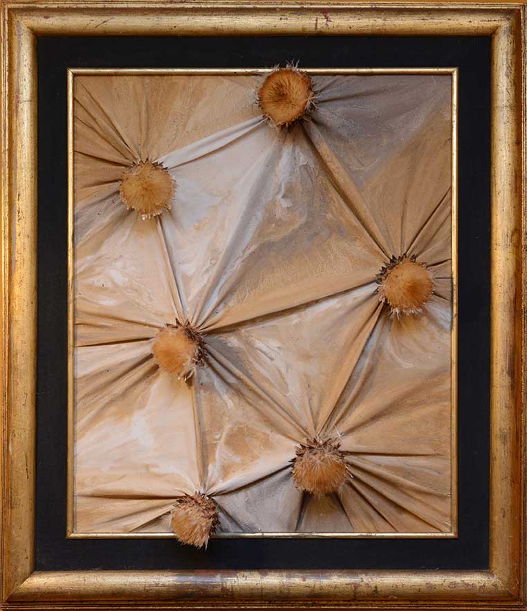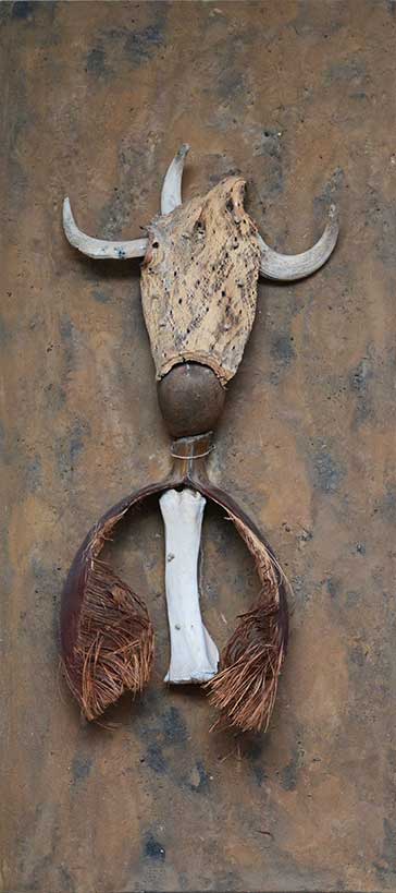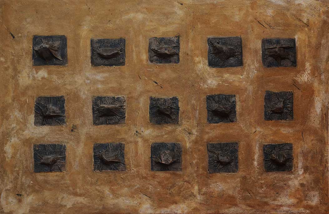 Le travail que j’appelle TERRE est né dans les forêts, dans les champs et les chemins, où j’ai installé mes ateliers éphémères. De ma danse avec l’herbe, la frondaison des arbres, la terre, la poussière, le vent, la lumière sont nées ces œuvres, composées d’humus, de racines, d’épis de blé, de pierres, de glands, d’os, de plumes dressés sur la toile, donnant naissance aux sens qui émergent en moi de cette refonte avec la nature, avec la matière même qui m’inspire et m’aspire.